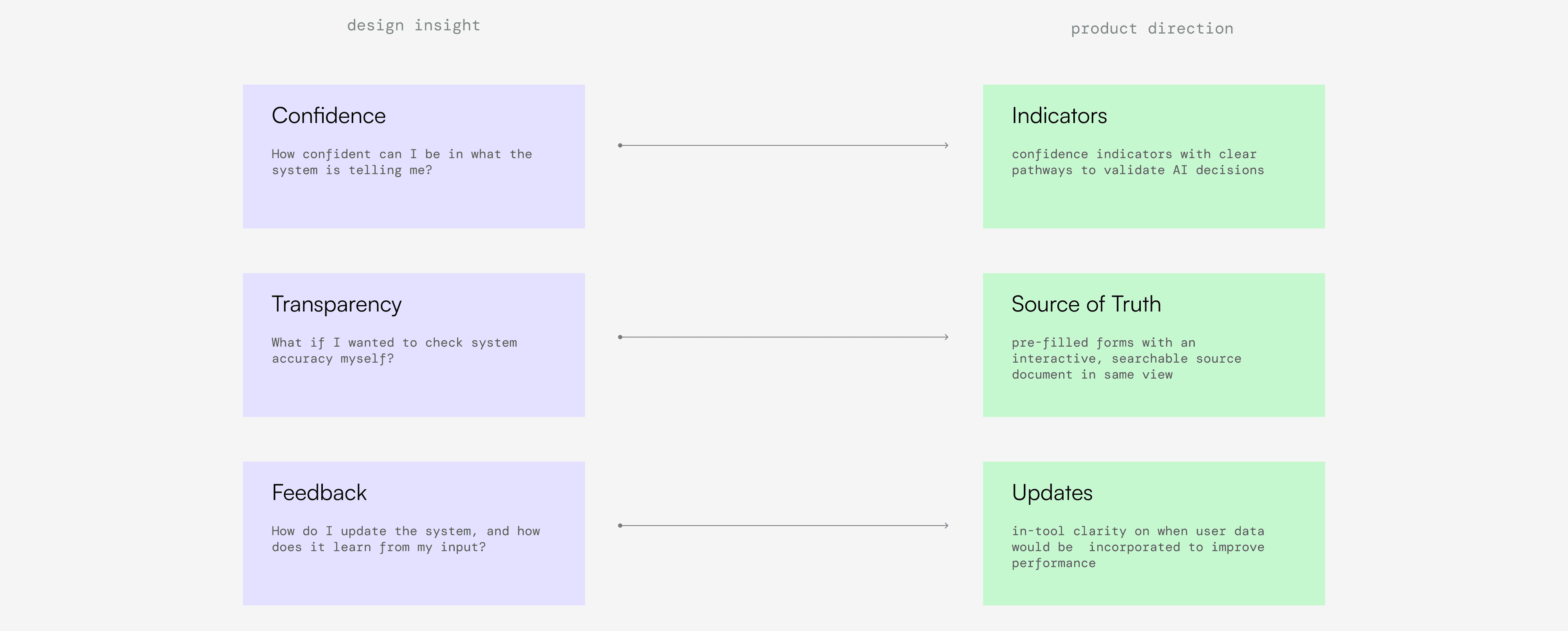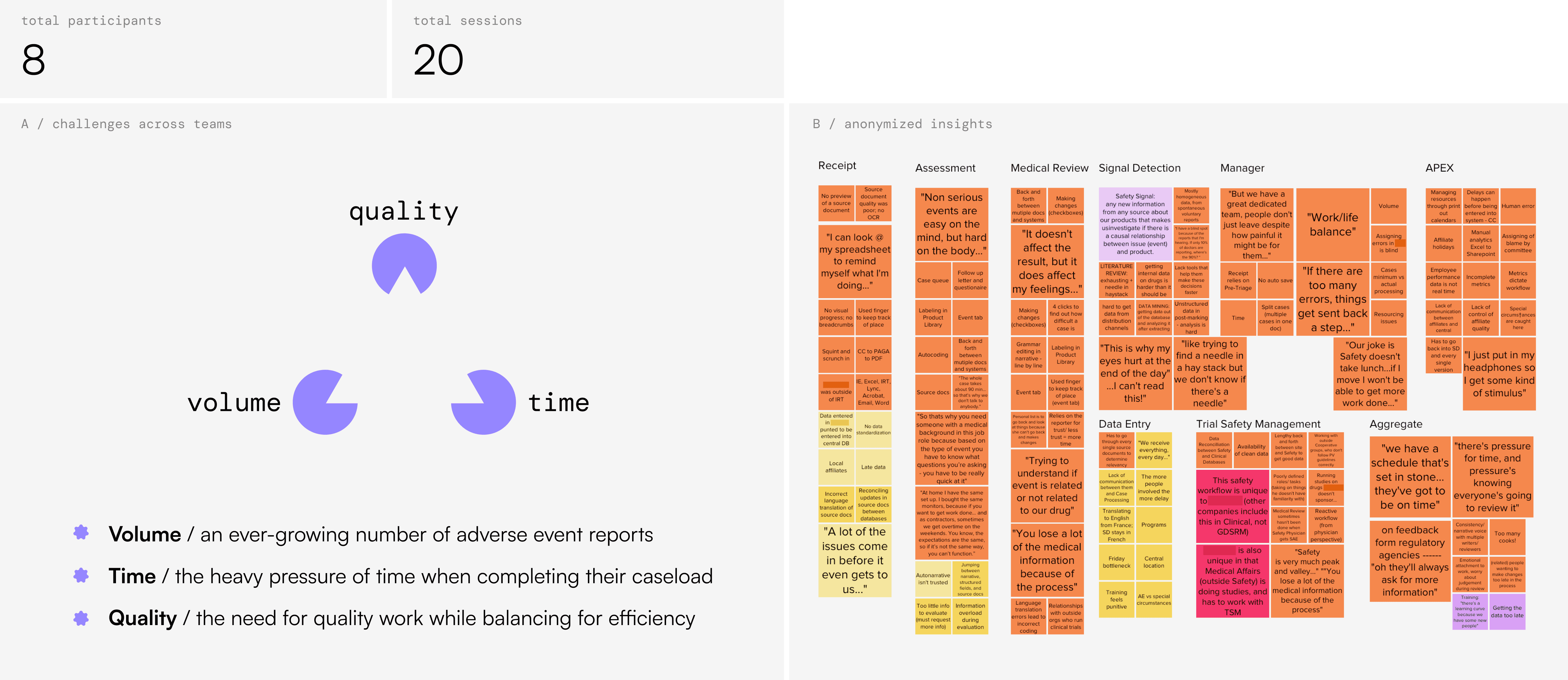 The fundamental barrier to adoption was a lack of trust, of both AI and the company. Conversation topics with employees ranged from fear of automation and job loss, to pride in helping people at work despite the stress. It was also apparent how much critical domain knowledge permeated the Safety team, from data entry to medical review staff. These findings dovetailed with a compliance ecosystem that couldn't use full AI automation due to FDA regulations. It was clear we needed to evolve the original blackbox AI prototype into a system that could address both human and regulatory concerns.