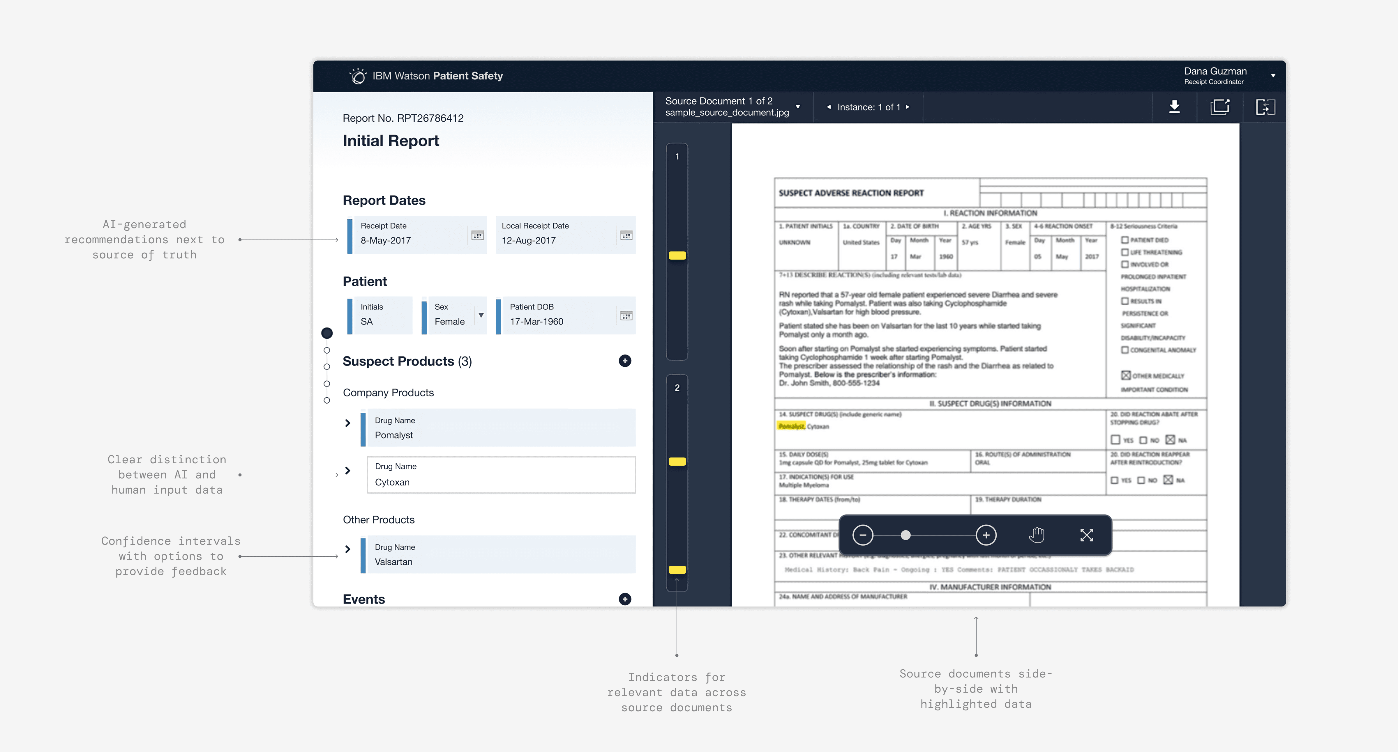 In 2016, My team at IBM Watson Health were charged with developing a new, end-to-end product in the Drug Safety space, with anchor client Celgene. Our goal was to manage the hundreds of adverse event reports Celgene received daily to efficiently identify side effects, determine their severity and causality, package them for FDA reports, and learn from the data to improve their therapeutics.