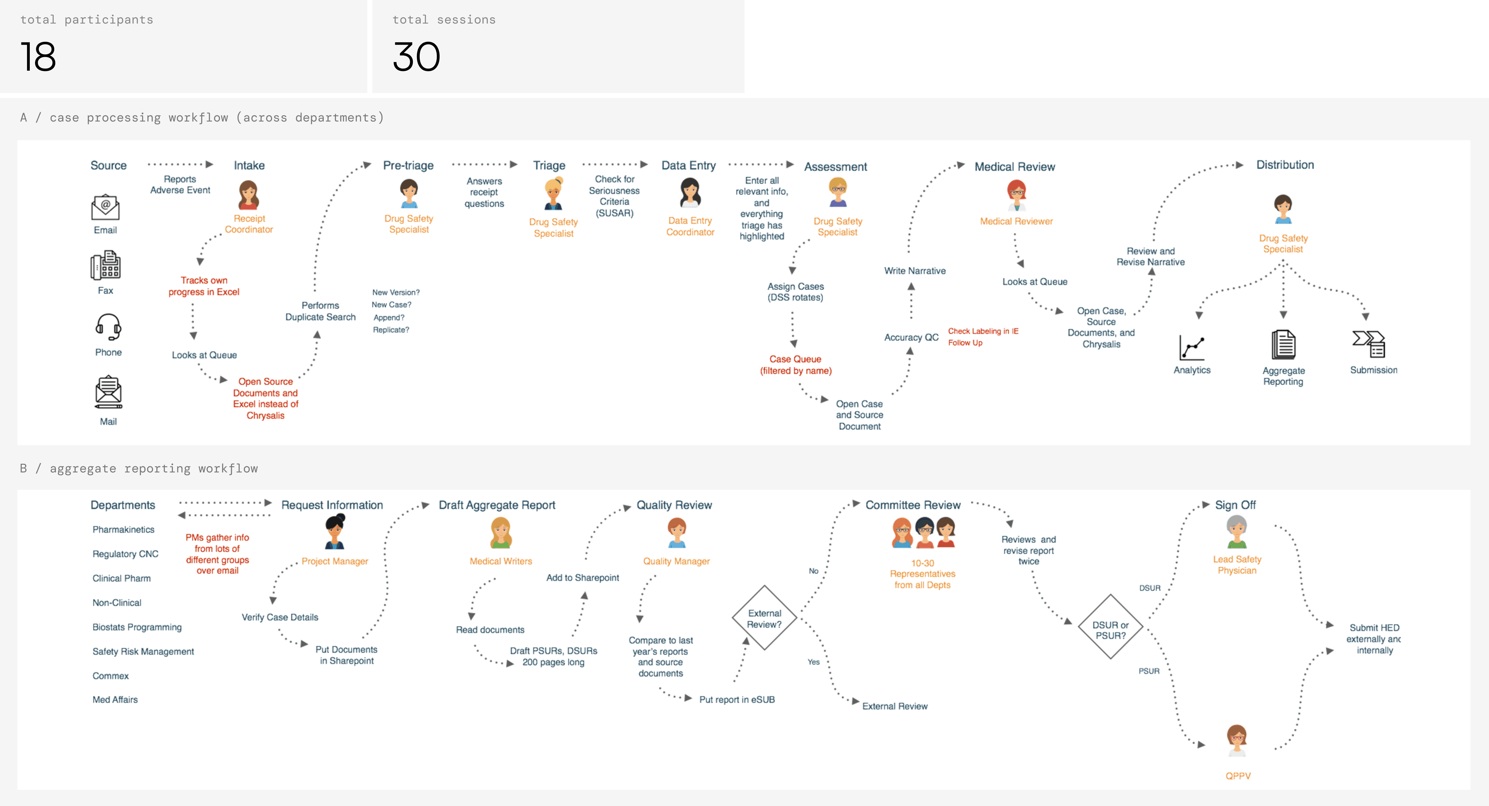 To figure out what would ease this pressure, I co-organized and led a design workshop and invited a diverse slice of Celgene to join us, from executive stakeholders to data entry ICs. The activities we ran provided a safe space for Safety staff to describe challenges they faced. Celgene's technology stack was antiquated — employees told us they needed Excel, not AI. The earliest stages of Drug Safety felt the most time pressure because they handled a constant stream of adverse event reports submitted to the company at any time, in any format. In addition, apprehension about AI was also quite high.